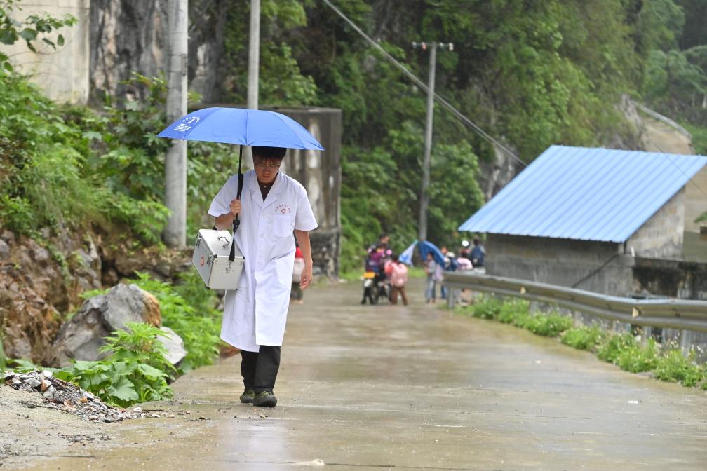 在广西大化瑶族自治县板升乡弄雷村,村医蒙富松走在村道上,准备进村入户给村民看病(2025年5月27日摄)。