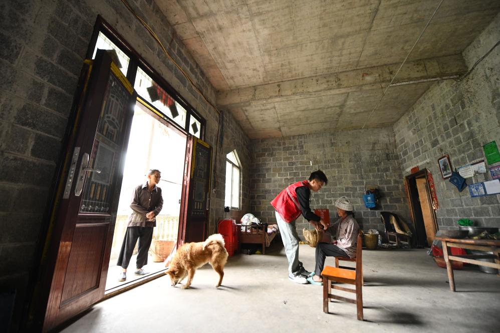 在广西大化瑶族自治县板升乡弄雷村,蒙富松进村入户给村民看病(2023年5月24日摄)。