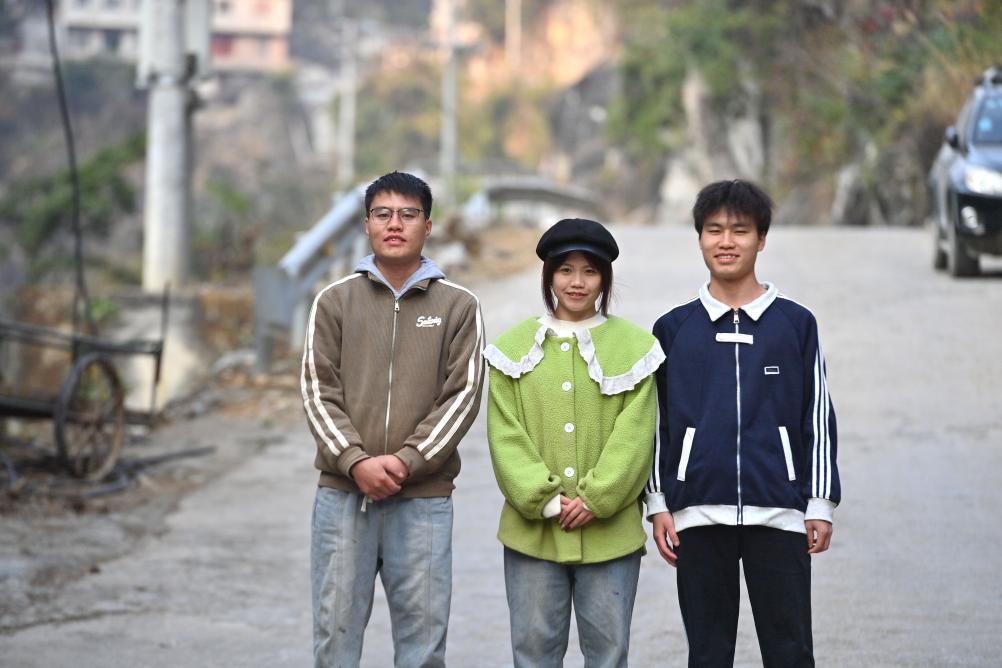 在广西大化瑶族自治县板升乡弄雷村,村医蒙富松(左)和弟弟妹妹合影(2025年1月20日摄)。蒙富松的弟弟妹妹目前正在读大学。