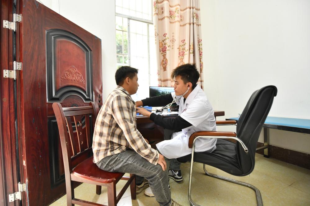 在广西大化瑶族自治县板升乡弄雷村卫生室,村医蒙富松(右)在给村民看病(2023年5月24日摄)。