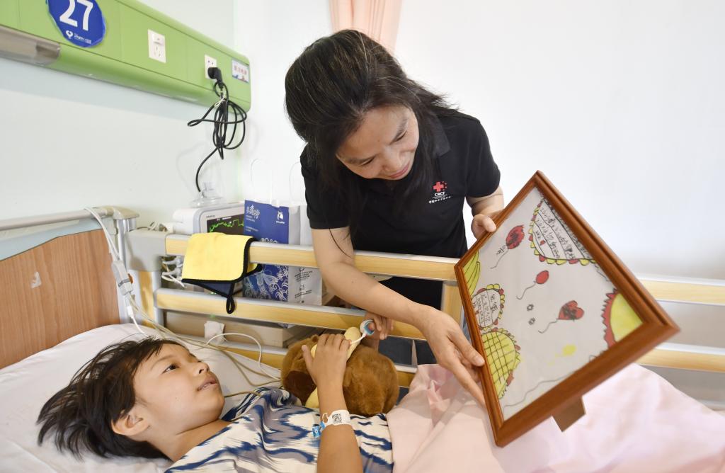 5月28日,中国红十字基金会代表给来自新疆维吾尔自治区阿克苏地区的先天性心脏病患儿送来节日礼物并观看小患者回赠的绘画作品。
