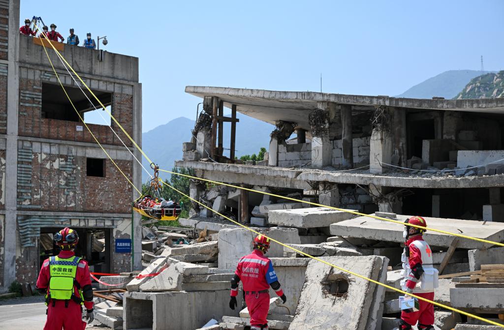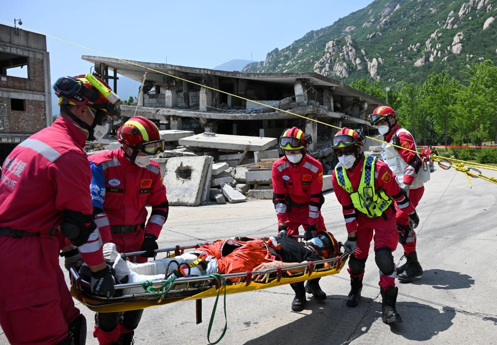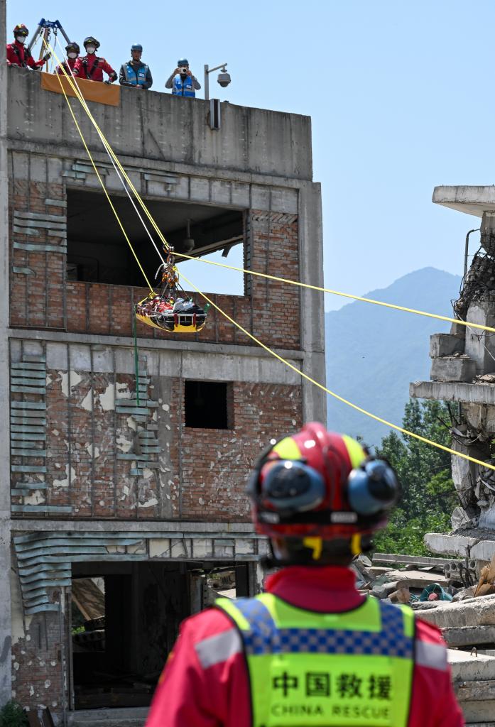 5月28日,中国国际救援队在位于北京的国家地震紧急救援训练基地进行地震搜救演练,这是队员在“地震现场”利用转运系统将“幸存者”从高处斜向转移至地面。