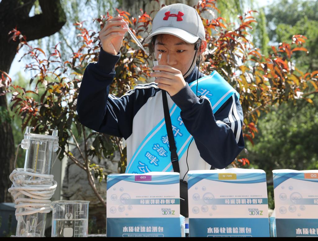 6月2日,在北京什刹海景区,北京四中(北海校区)的学生志愿讲解员现场检测什刹海水质。