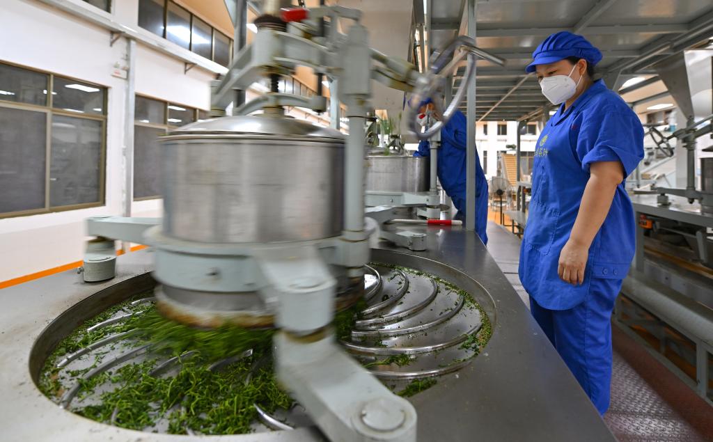 6月7日,工人在海南省农垦五指山茶业集团股份有限公司保亭金江五指山分公司茶厂加工茶叶。