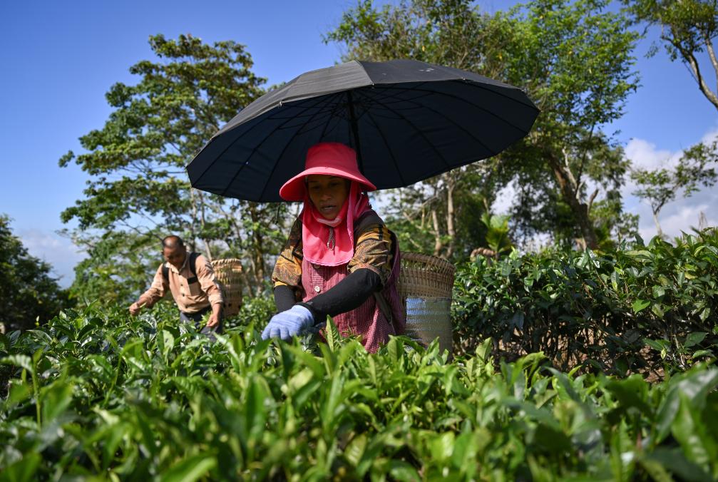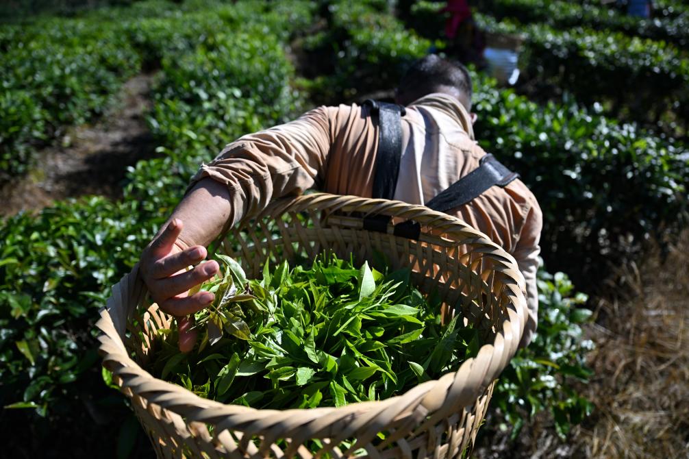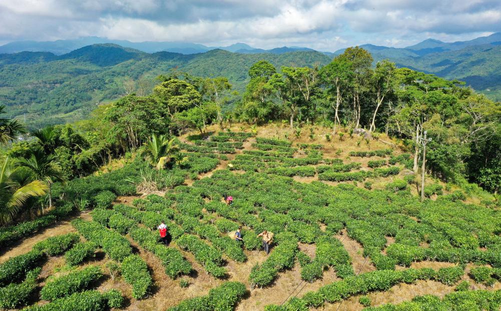 6月8日,工人在位于海南五指山市与保亭黎族苗族自治县交界处的海南农垦金鼎茶园采茶。
