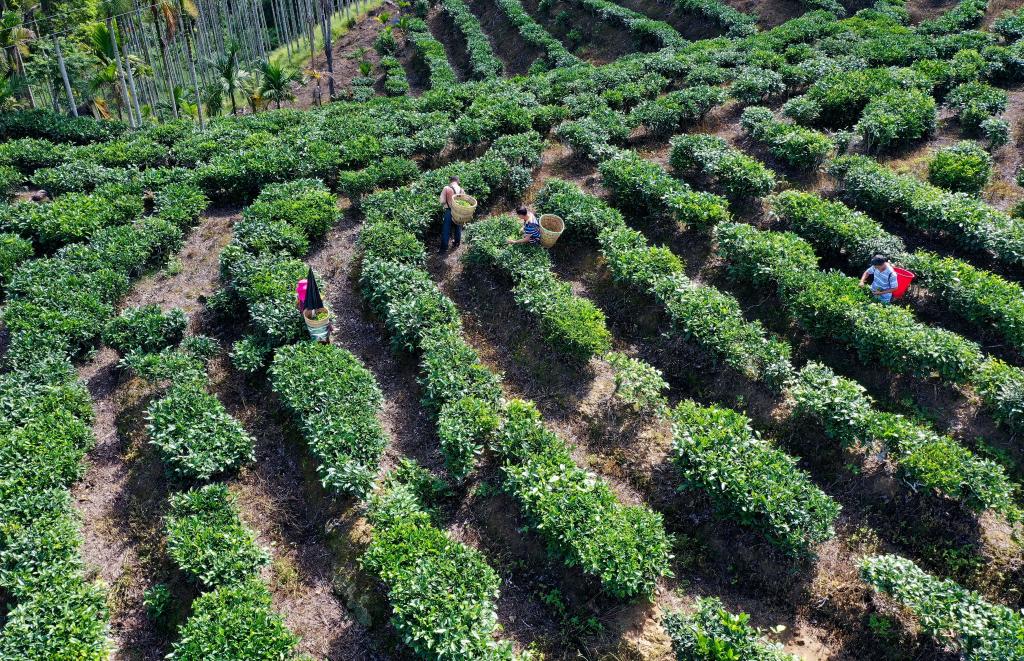 6月8日,工人在位于海南五指山市与保亭黎族苗族自治县交界处的海南农垦金鼎茶园采茶(无人机照片)。
