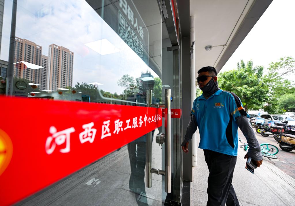 6月9日,一名外卖员走进天津市河西区职工服务中心工会驿站。