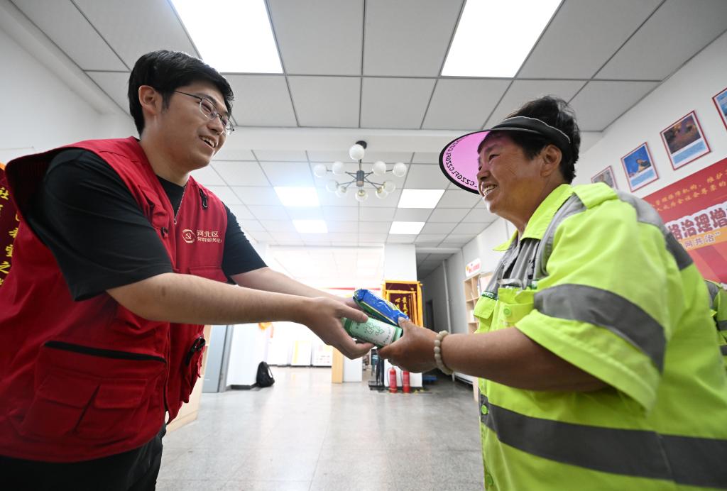 6月7日,天津市河北区昆云里社区工作人员给在工会驿站休息的环卫工人送防暑物品。
