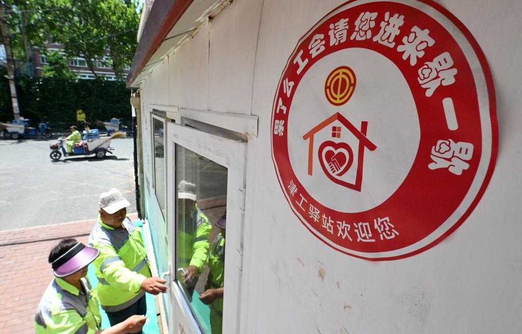 6月7日,环卫工人走进位于天津市河北区昆峰里小区的一处工会驿站。