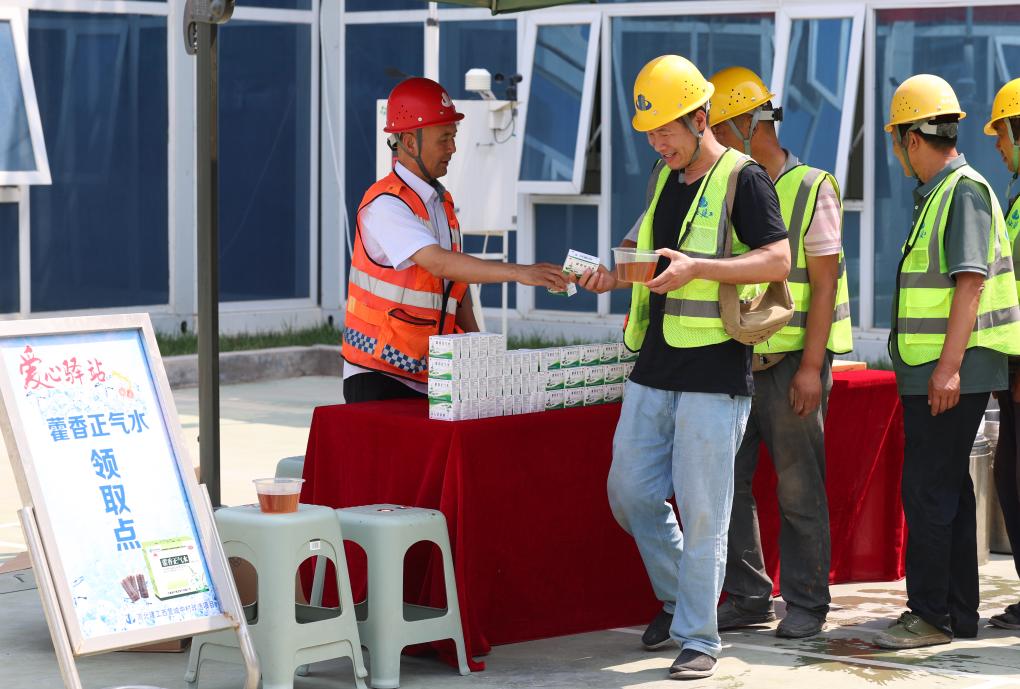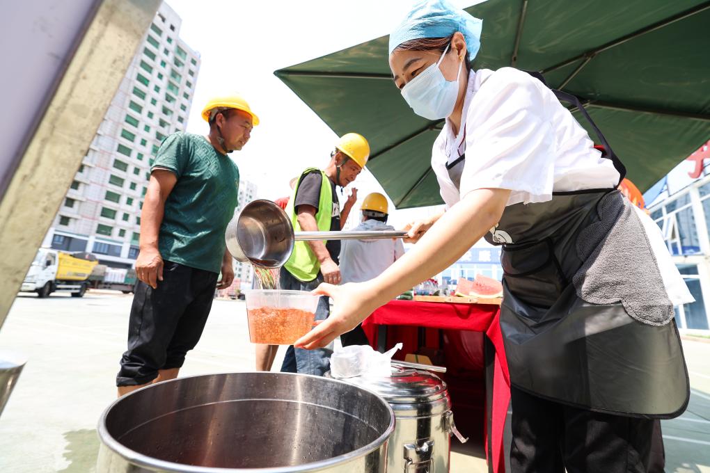 6月11日,在河北省石家庄市新华区西营城中村改造项目施工现场,工作人员为建筑工人盛绿豆汤。