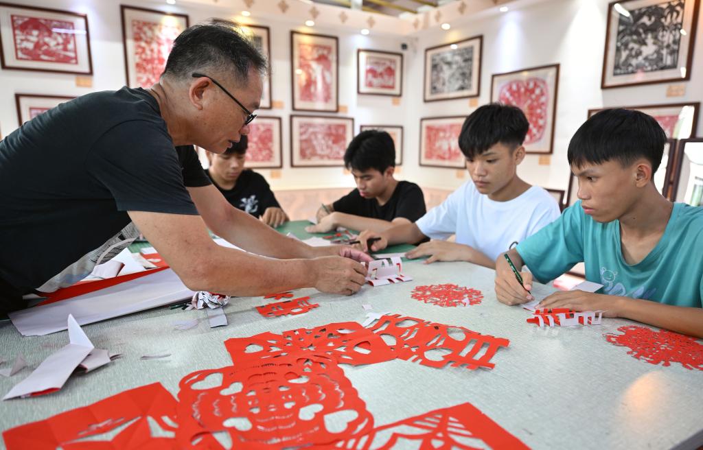 6月10日,海南省民族技工学校老师韦勤在教学生黎族剪纸。