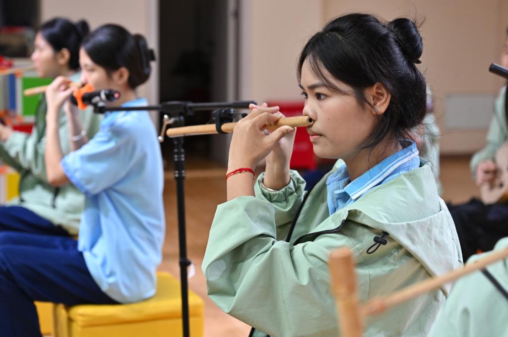 6月12日,海南省民族技工学校学生在练习黎族鼻箫。
