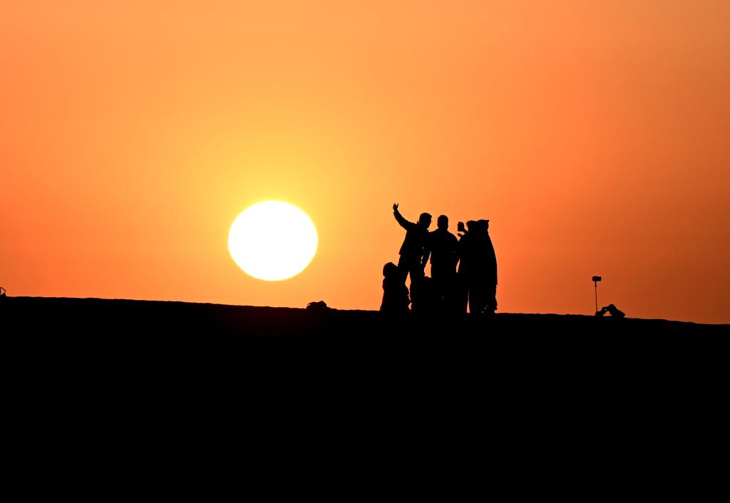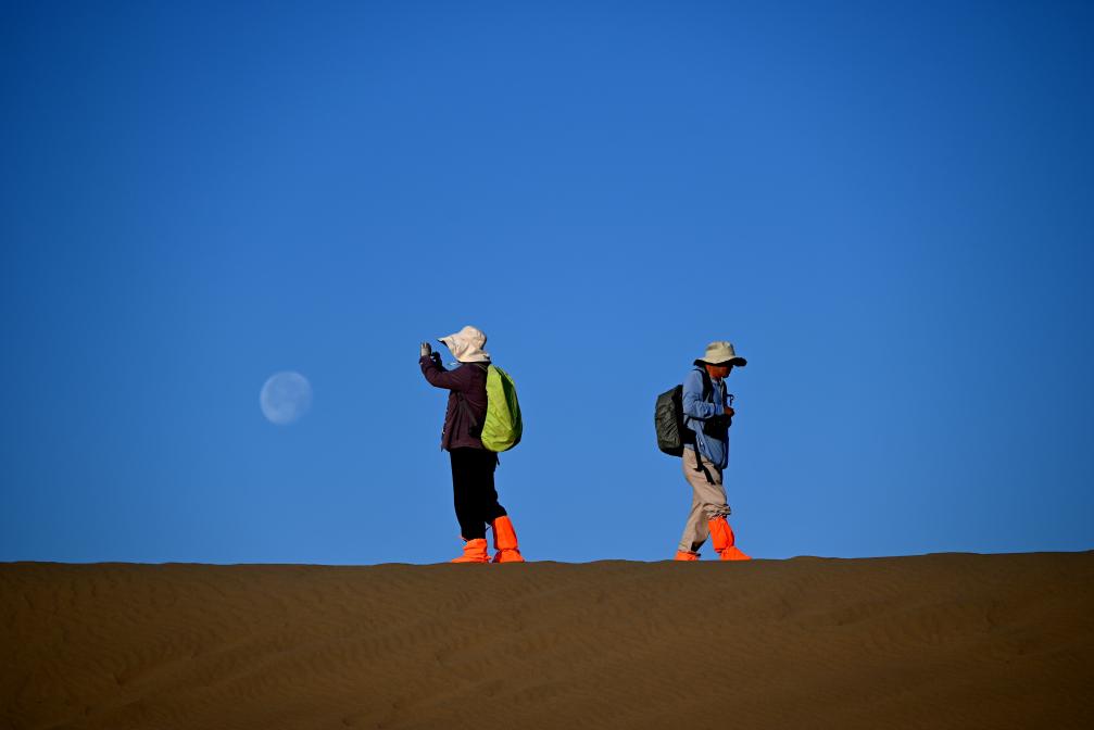 6月14日,游客在甘肃敦煌世界地质公园鸣沙山月牙泉景区观赏大漠日出美景。
