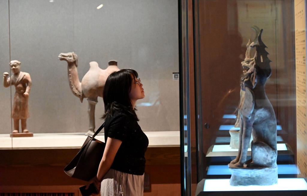 6月14日,游客在甘肃省敦煌市博物馆参观文物展。