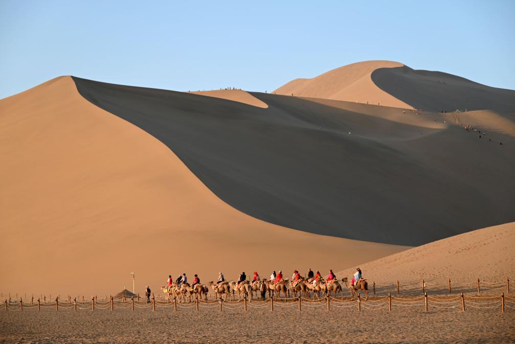 6月14日,游客在甘肃敦煌世界地质公园鸣沙山月牙泉景区游览。