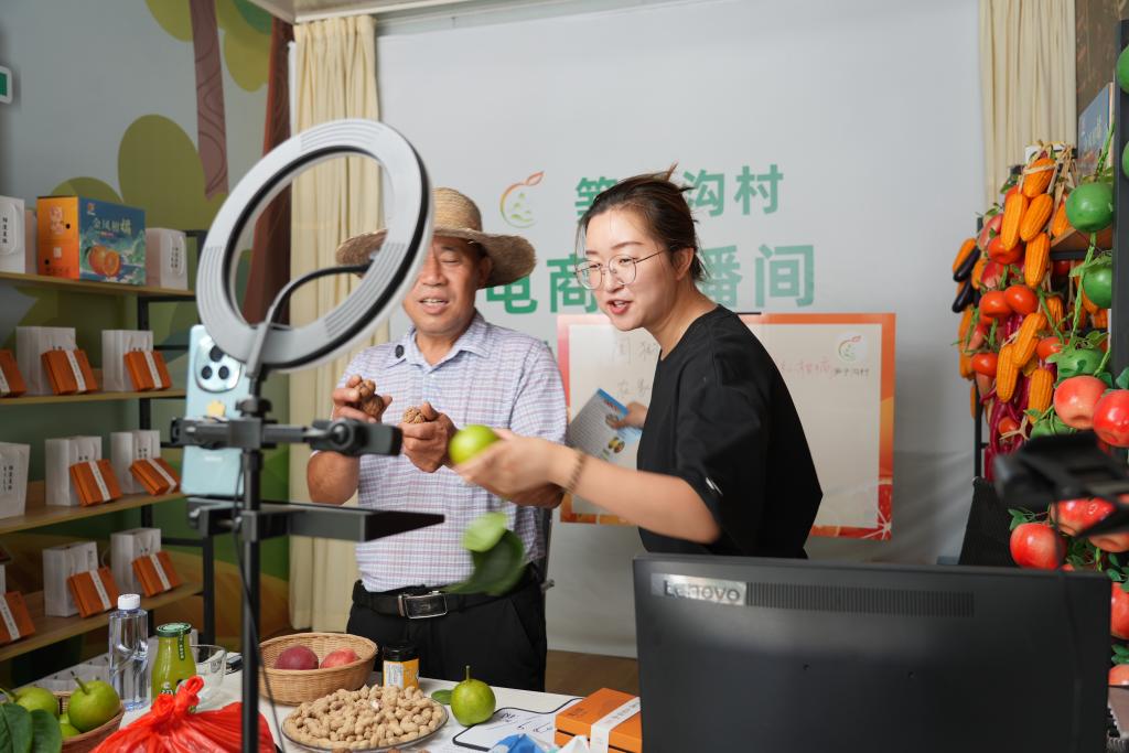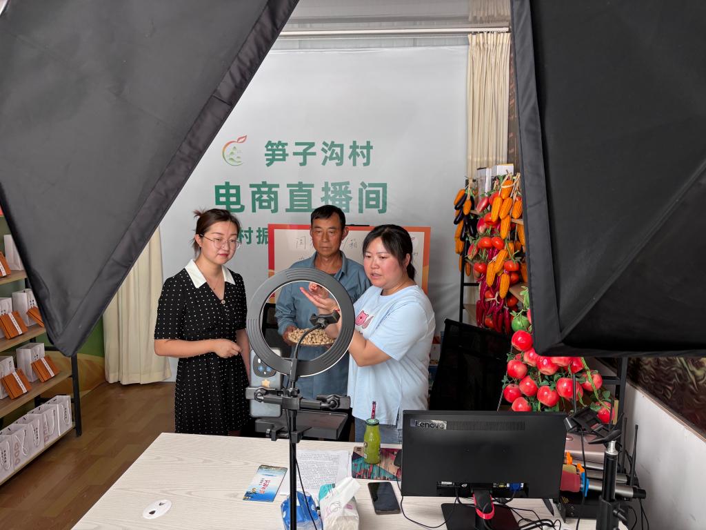 6月17日,在四川省广元市苍溪县陵江镇笋子沟村电商直播间,村支部书记张桂华(左)和村民一起直播。