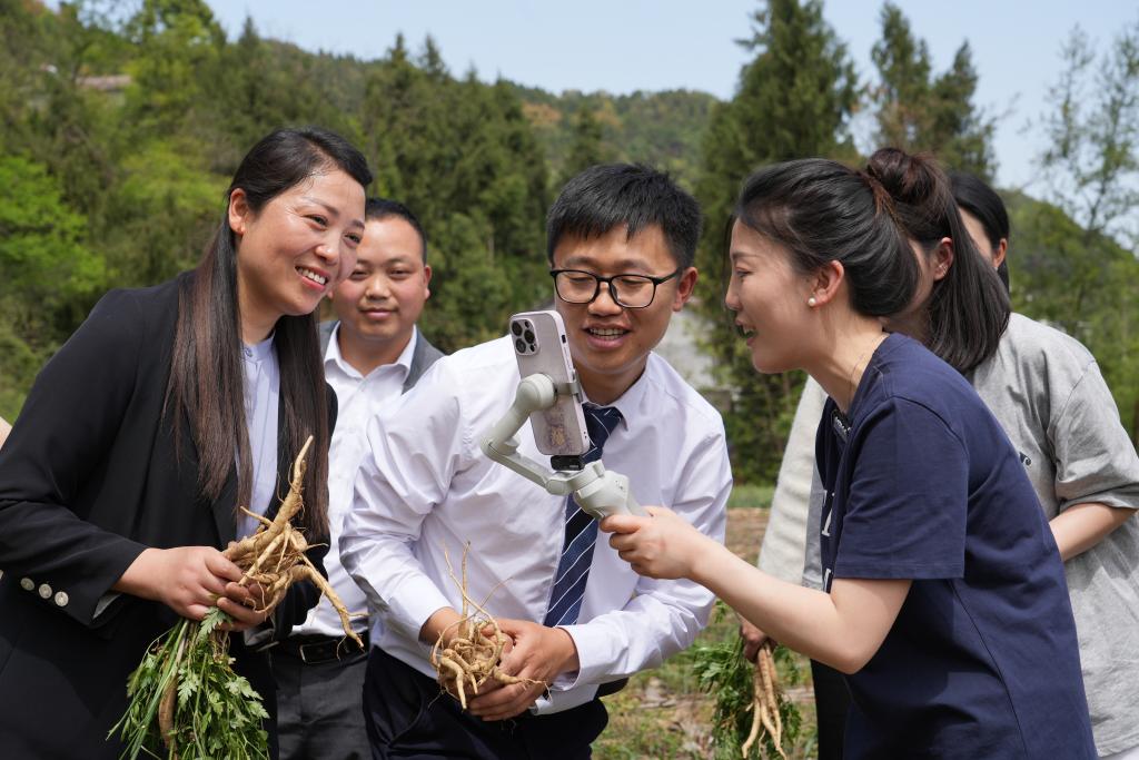 4月9日,“村播”们在四川省广元市苍溪县的沙参园直播。