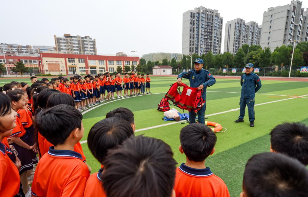 暑假临近,河北省邯郸市邱县第二中学附属小学开展安全教育活动,学生在蓝天救援队的指导下学习防溺水常识、演练急救技能,提高安全意识和自救能力。