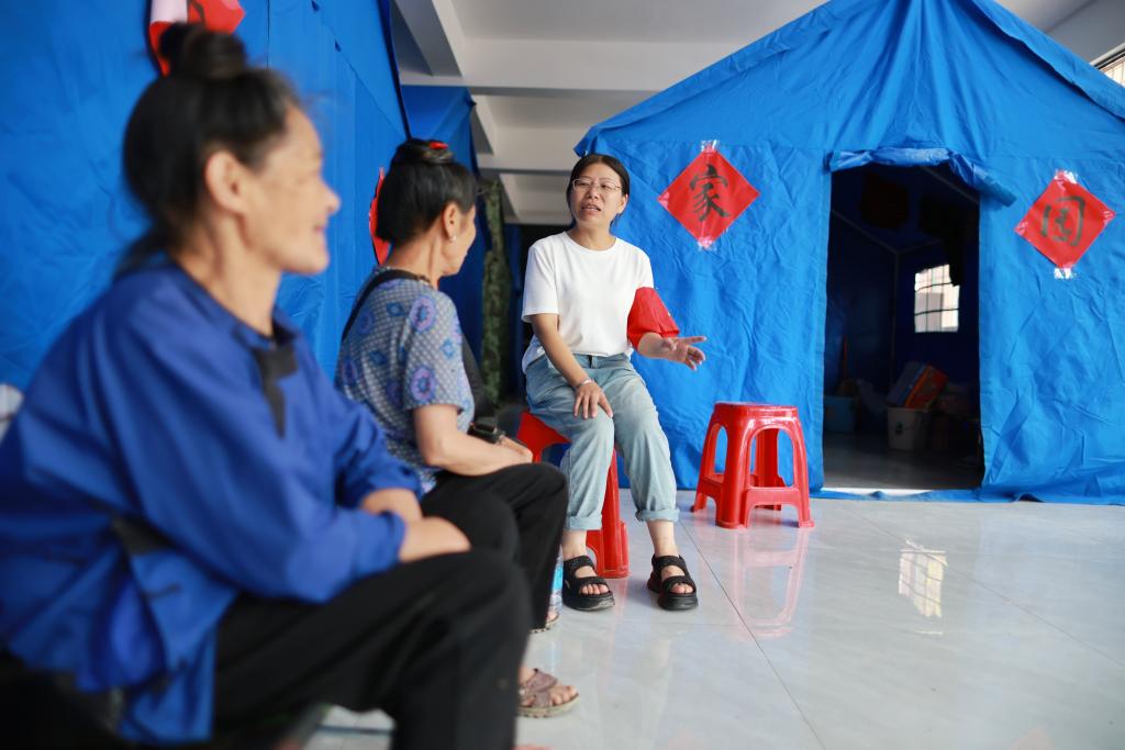 6月29日,榕江二中教师、党员杨会红(右)在榕江二中安置点与受灾群众交流。