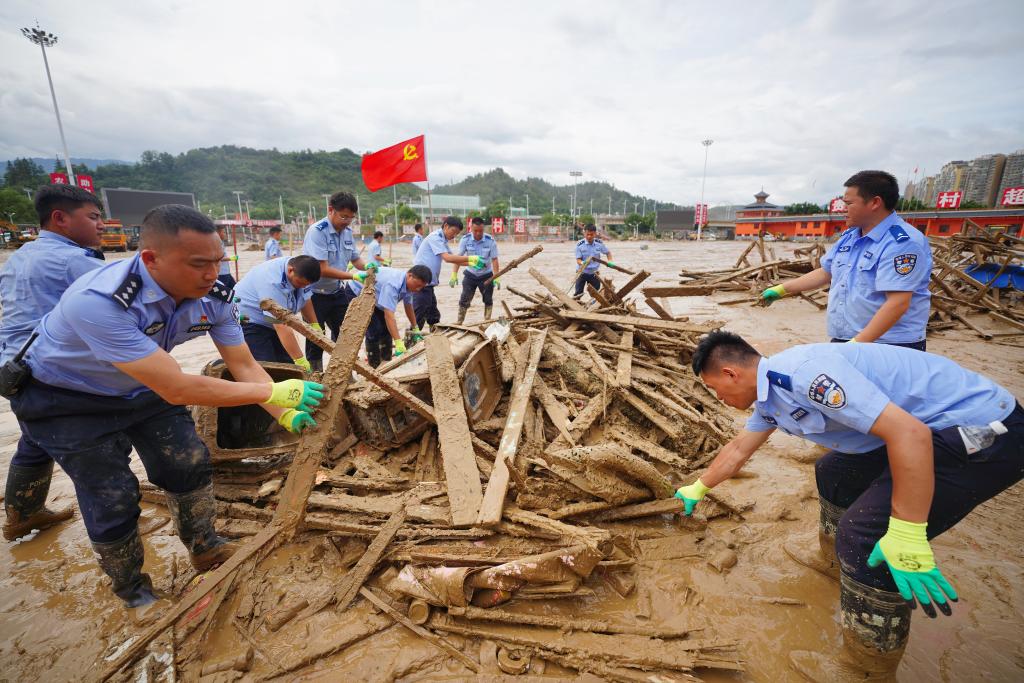 6月29日,在贵州省榕江县“村超”球场,来自丹寨县公安局的党员民警潘建航(左二)和同事一起清理因洪灾受损的球场设施。