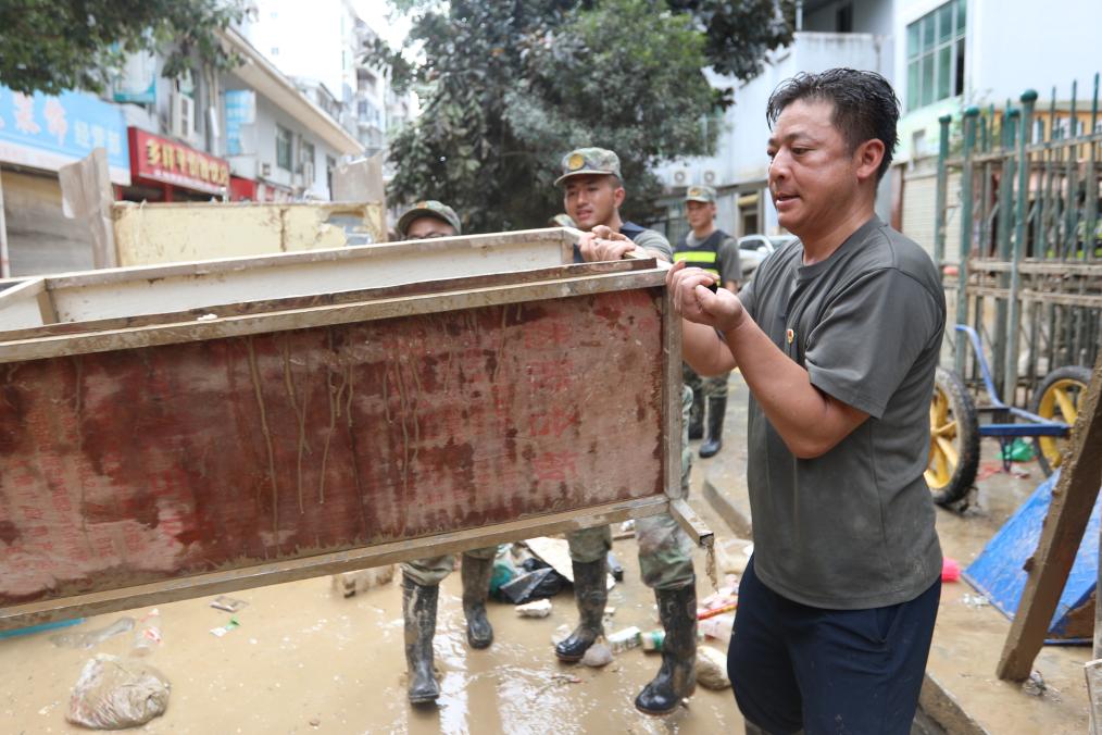 6月29日,在榕江县车民街道文体中心社区,来自岑巩县人武部的党员陈宏祥(右一)与同事为受灾群众清运杂物。