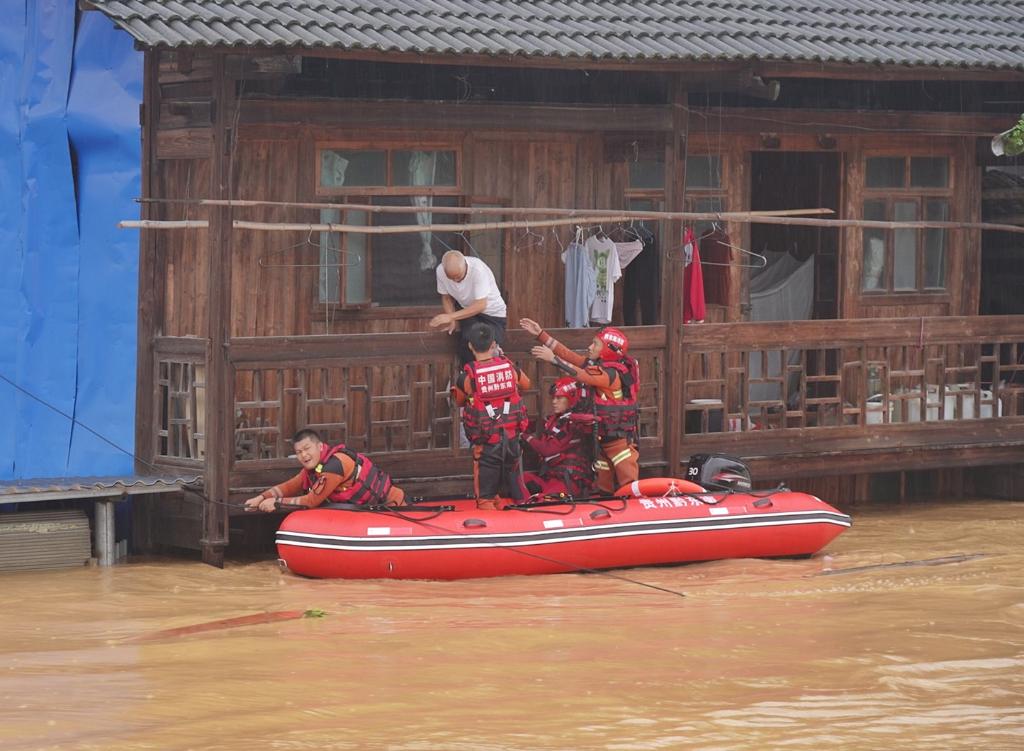 6月24日,榕江县消防队员、党员张齐武(右一)和同事在转移居民。