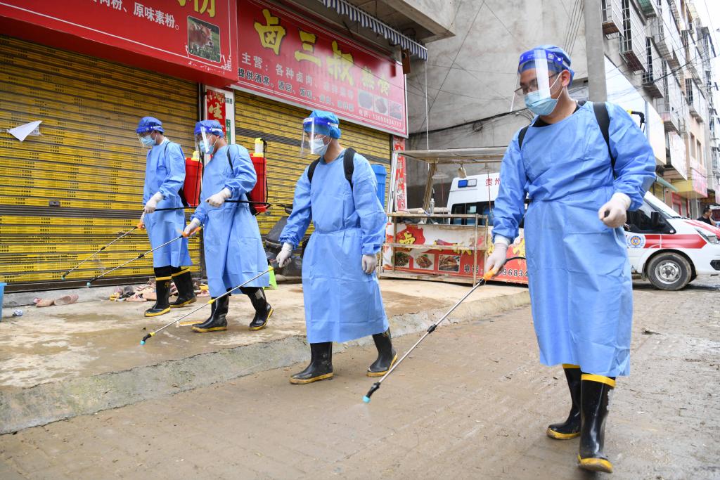 6月29日,在榕江县古州镇车寨社区,来自黄平县疾病预防控制中心的党员吴国华(右一)与同事进行消杀作业。