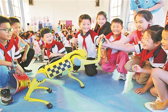 6月30日,江苏连云港,小学生和“四足仿生机器狗”互动。当日,江苏海洋大学创新创业学院组织师生团队走进连云港市连云区板桥街道板桥小学,开展“科技筑梦 智慧未来”暑期社会实践活动。大学生携带跳舞机器人、八推水下机器人、四足仿生机器狗、步兵机器人等多种“智能机器人”组团亮相,为孩子们进行机器人“绝活”展示操作,在与机器人互动体验中,近距离感受人工智能科技魅力。