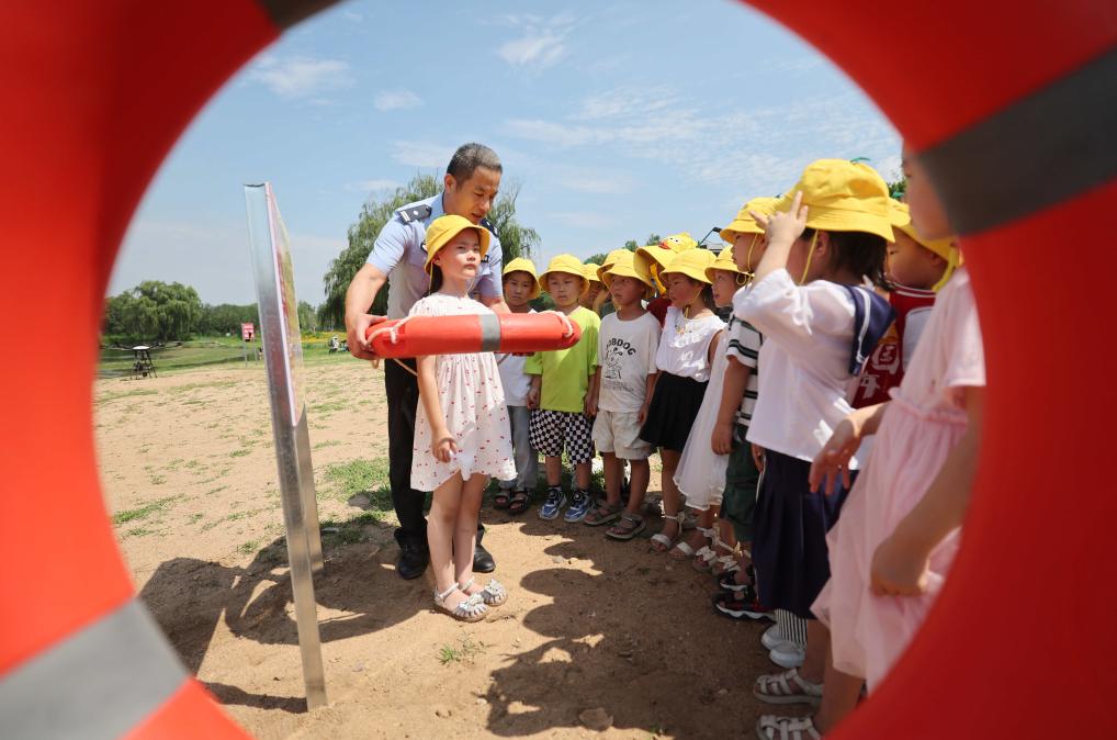 7月2日,山东省临沂市沂南县公安局特巡警大队的民警为界湖街道中心幼儿园的小朋友讲解救生圈的使用方法。