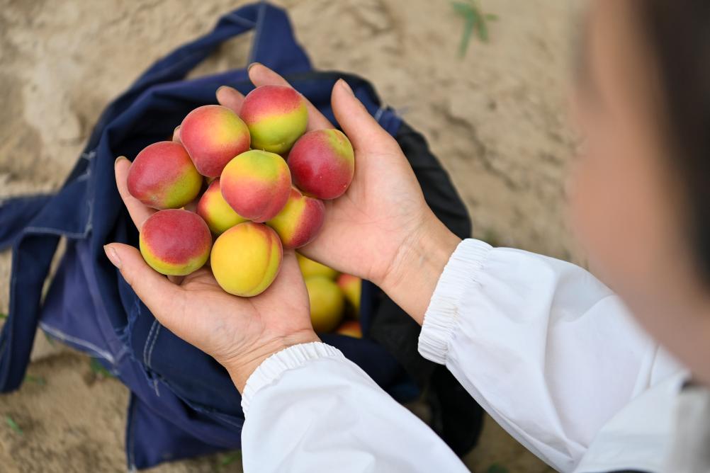 山西省吕梁市兴县蔡家崖村村民展示刚采摘的红梅杏(7月1日摄)。