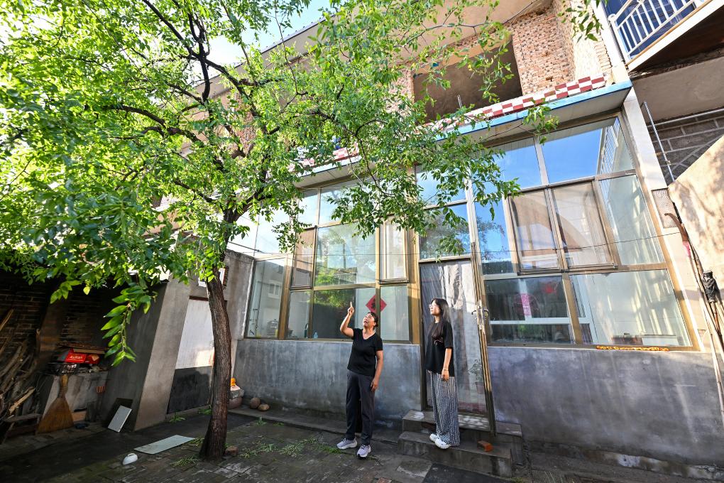 山西省吕梁市兴县蔡家崖村村民牛雨梅(左)和女儿在自家小院内查看枣树长势(6月30日摄)。