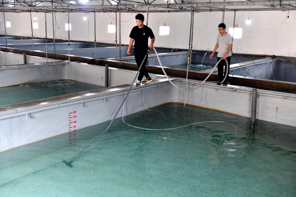 7月4日,在日照市东港区涛雒镇一处育苗基地,工作人员在清理育苗池。