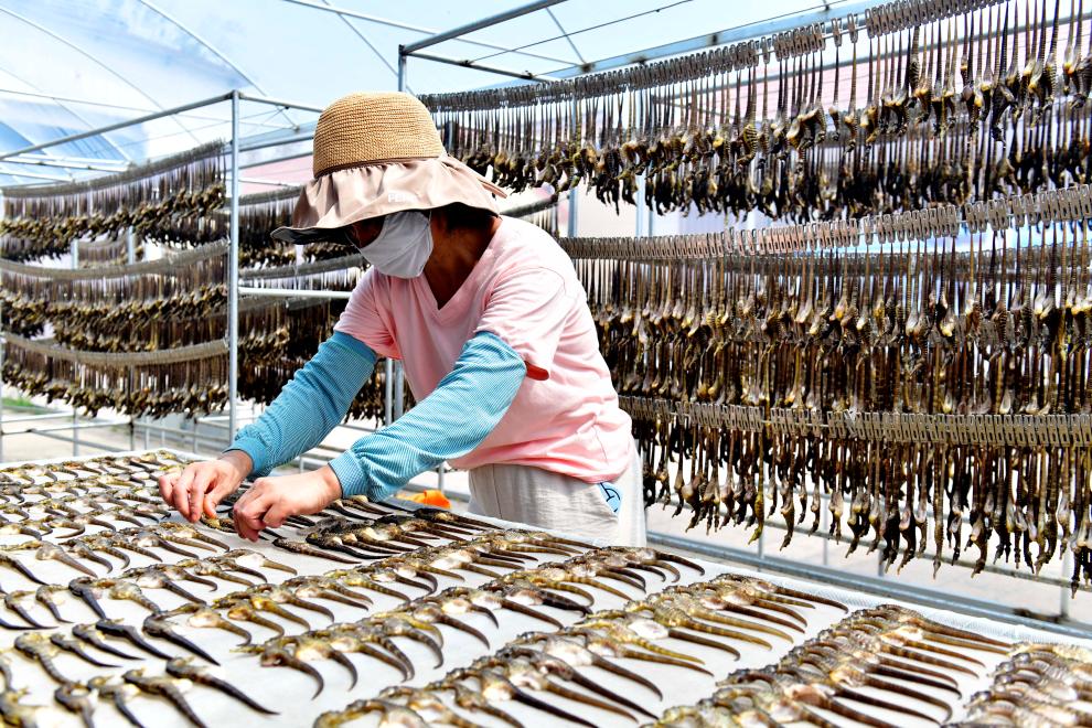7月4日,在日照市东港区涛雒镇膨腹海马养殖基地,工作人员在晾晒膨腹海马。