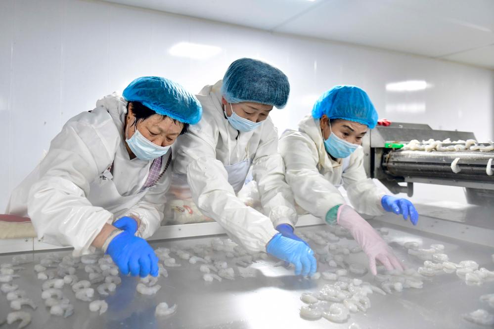 7月4日,在日照市东港区涛雒镇一家水产品加工企业,工作人员在速冻生产线忙碌。