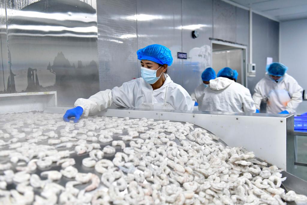 7月4日,在日照市东港区涛雒镇一家水产品加工企业,工作人员在速冻生产线值守。