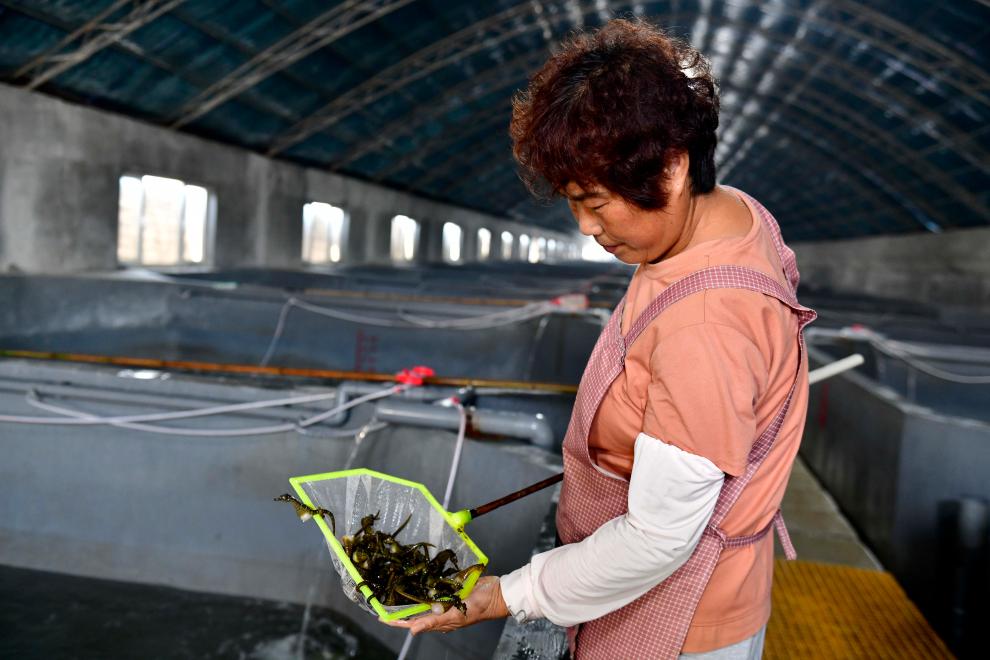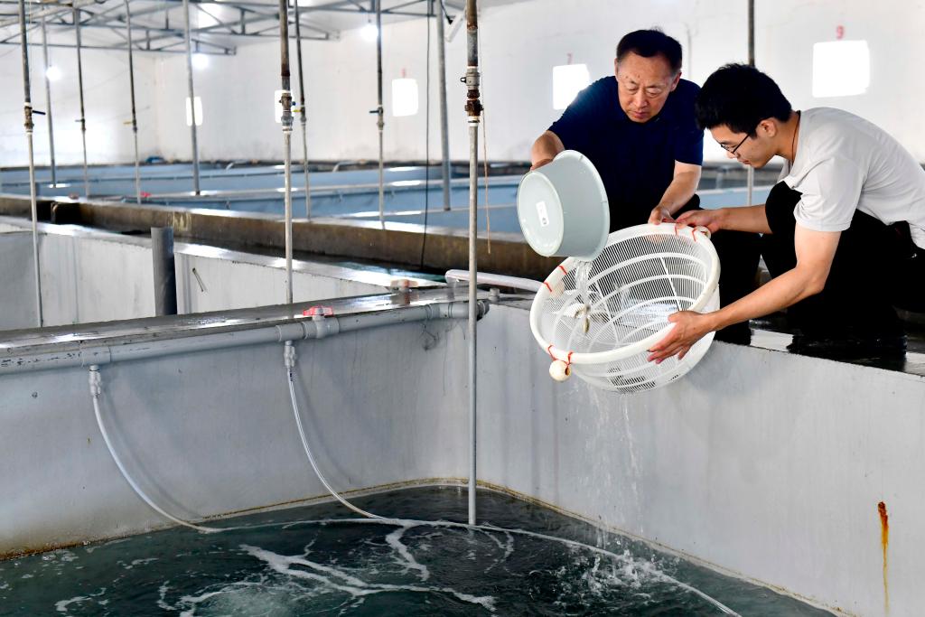 7月4日,在日照市东港区涛雒镇膨腹海马养殖基地,工作人员在查看膨腹海马长势。