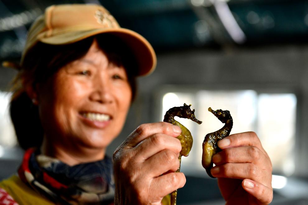 7月4日,在日照市东港区涛雒镇膨腹海马养殖基地,工作人员在展示膨腹海马。