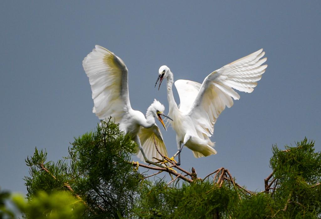 7月7日,两只白鹭在昆明滇池海洪湿地公园嬉戏。