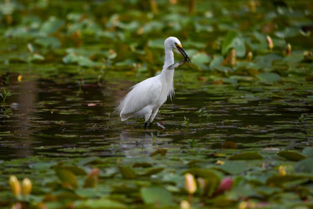 7月7日,一只白鹭在昆明滇池海洪湿地公园内捕食。