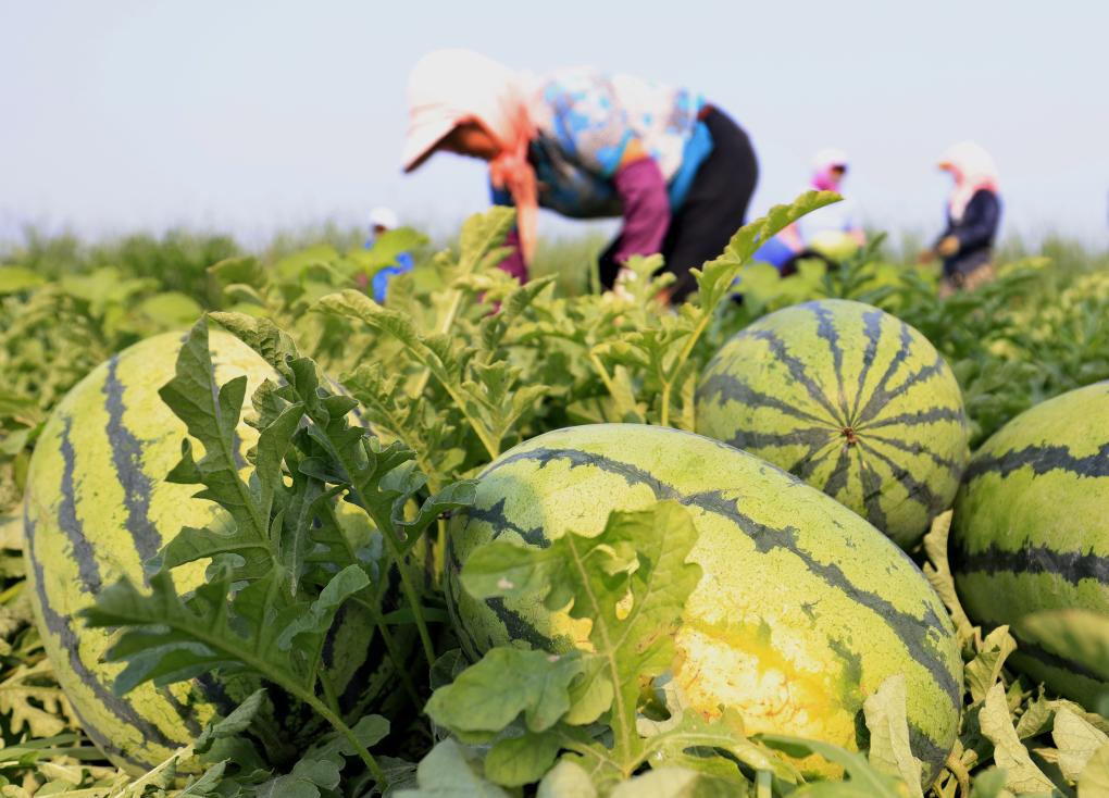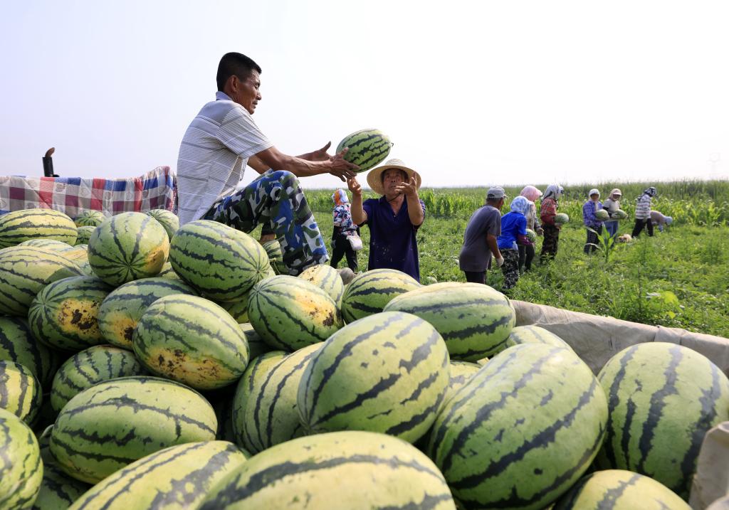 7月9日,河北省唐山市丰南区东田庄镇大吴庄户村的农民在田间收获西瓜。