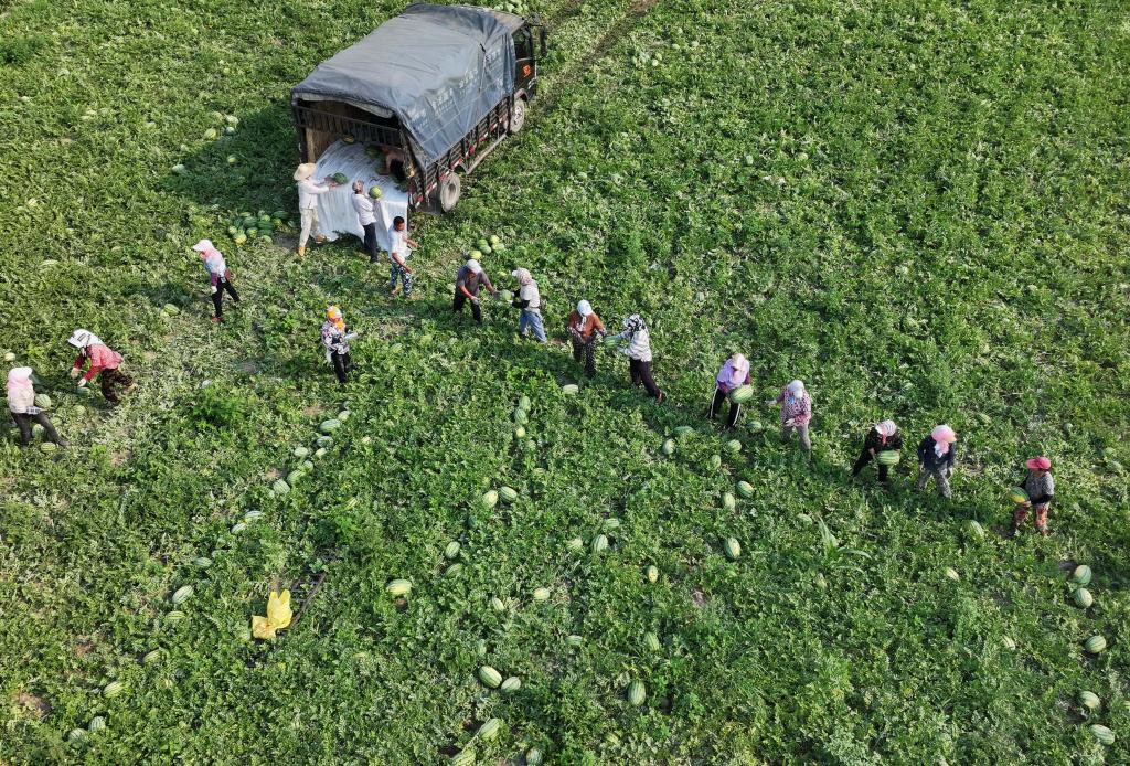 7月9日,河北省唐山市丰南区东田庄镇大吴庄户村的农民在田间收获西瓜(无人机照片)。