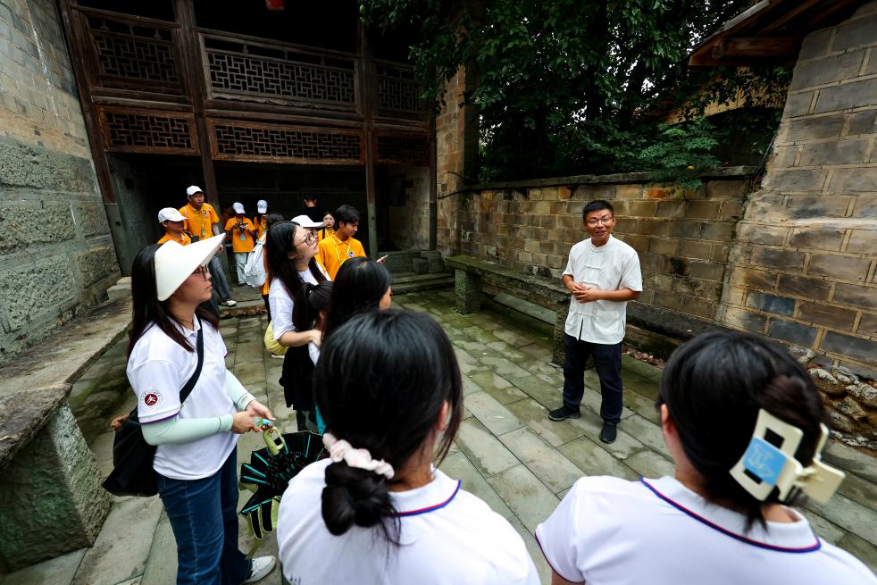 7月9日,在江西省抚州市金溪县双塘镇竹桥村,金溪县青田书院院长洪志文(右二)向来到金溪县开展暑期“三下乡”社会实践的师生介绍竹桥村文化传承和古建保护等情况。