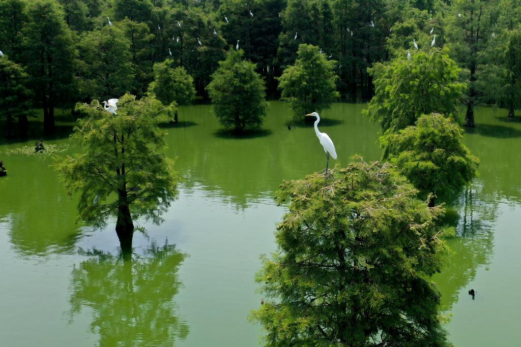 7月8日在江西省南昌县塔城乡湖陂村拍摄的鹭鸟群(无人机照片)。