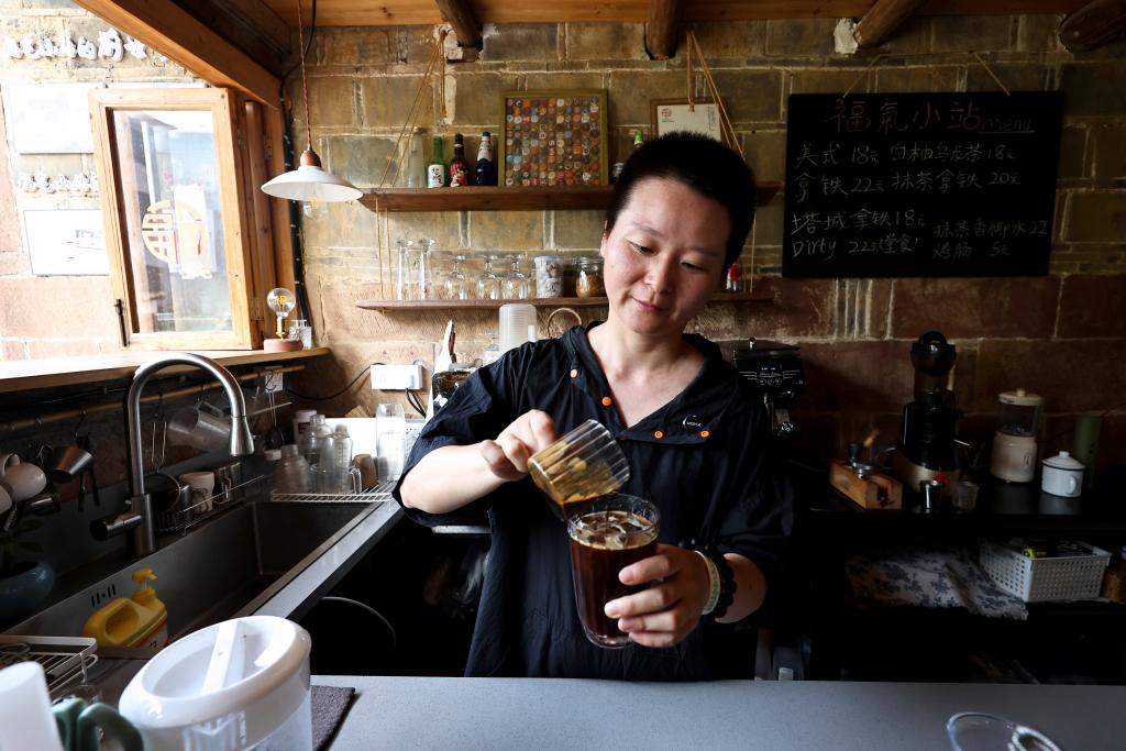 7月8日,在江西省南昌县塔城乡湖陂村,“福气小站”咖啡馆主理人彭白玲在制作咖啡。