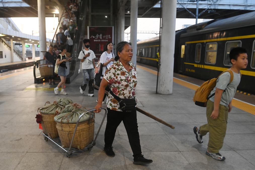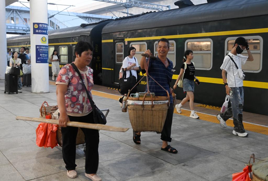 7月9日,在黎湛铁路玉林站,卖完水果的果农准备乘坐火车回家。