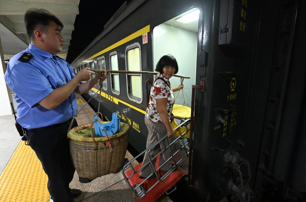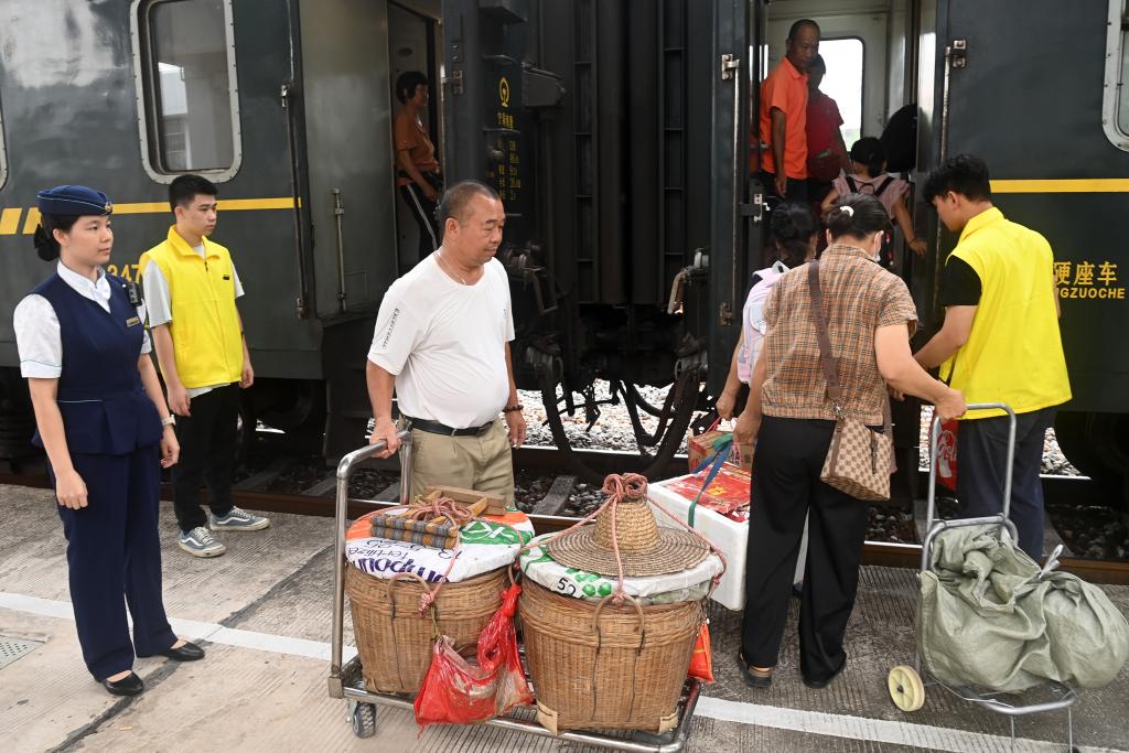 黎湛铁路线上的绿皮客运列车票价实惠,停靠车站多。多年来,铁路部门在车站设置了专门候车区,铁路工作人员常为挑重担的果农搭把手、帮个忙,为果农售卖水果提供便利。