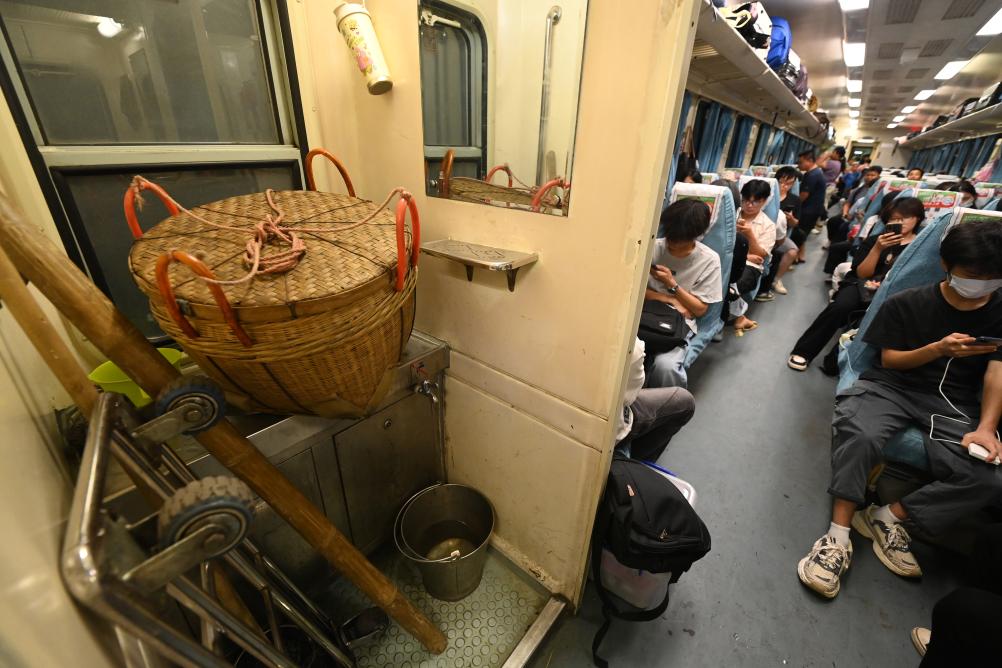 7月9日,在广西南宁市开往广东湛江市的绿皮火车上,果农将扁担、箩筐和拖车等工具放置在车上。