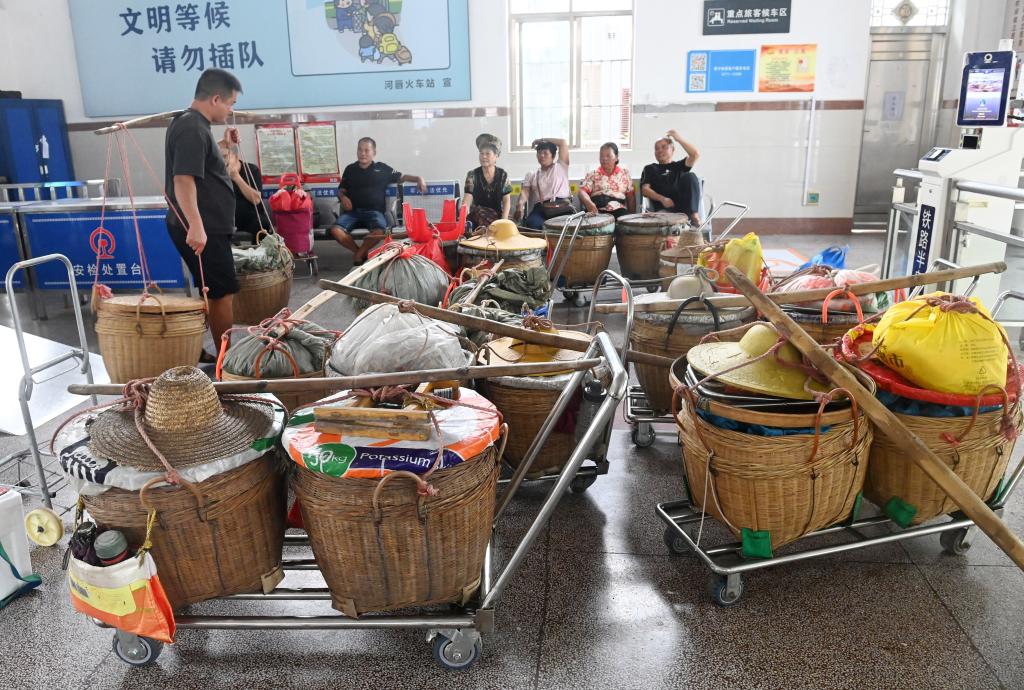 7月10日,在黎湛铁路河唇站,果农将装有水果的箩筐摆放在候车厅等待检票出行。