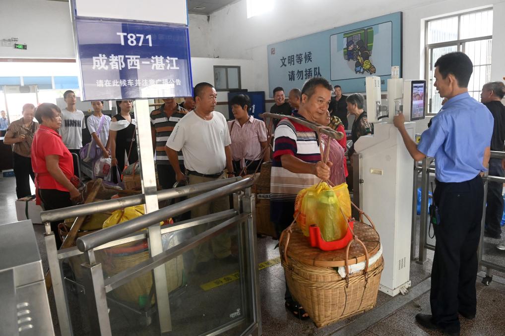 7月10日,在黎湛铁路河唇站,果农挑着水果通过检票口准备上车出行。