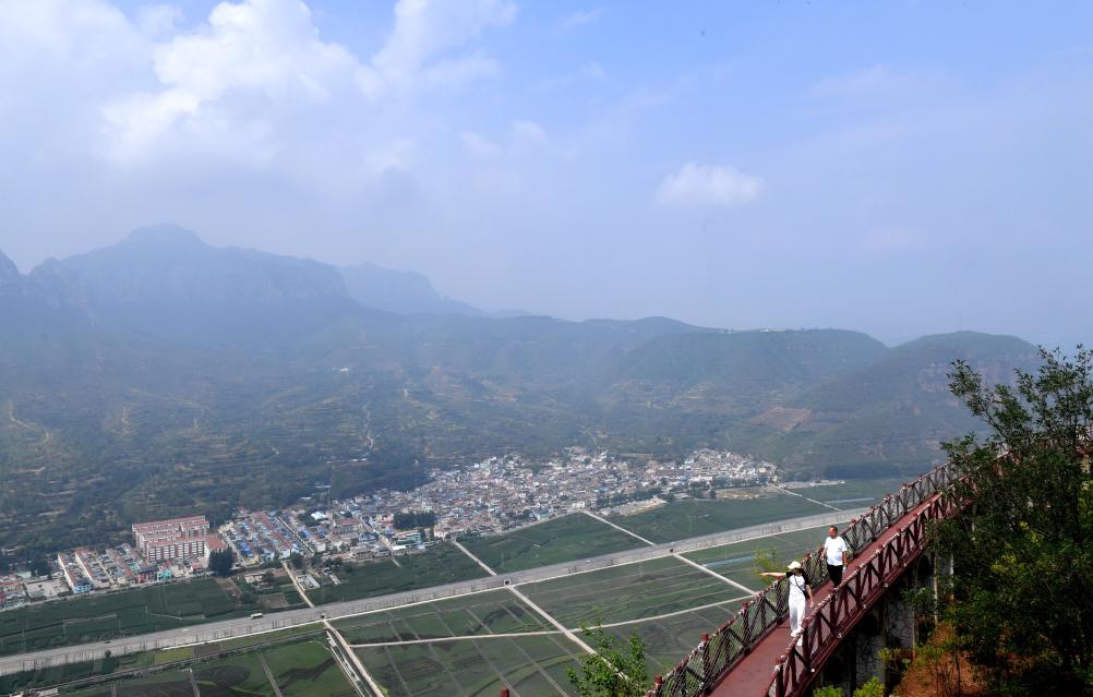 7月10日,游客在涉县东山景区观景栈道上游览。